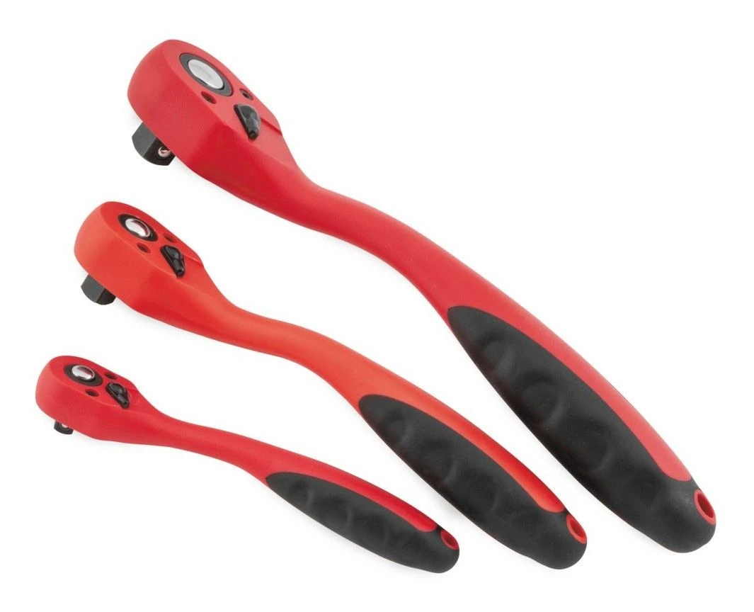 High-quality, smooth action ratchet set comes with 1/4″, 3/8″ and 1/2″ drives.